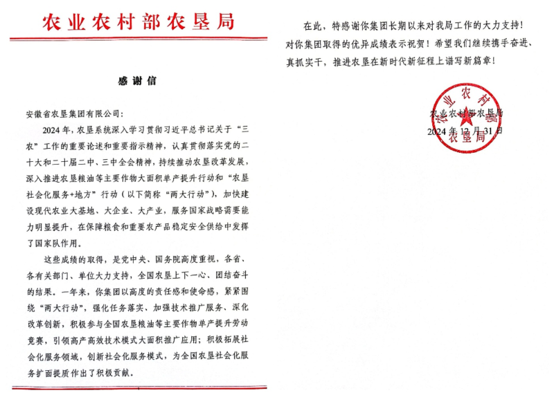 2025年元旦前夕,安徽省农垦集团收到农业农村部农垦局的感谢信。信件对开云手机登录入口围绕农垦粮油等主要作物大面积单产提升行动和“农垦社会化服务+地方”行动(简称“两大行动”)、加快建设现代农业大基地、大企业、大产业(简称“三大建设”)等方面取得的优异成绩提出表扬,并表示感谢。