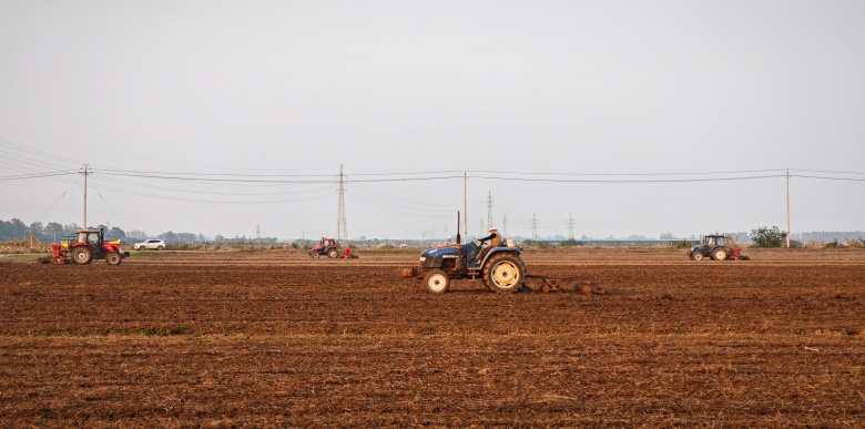 10月28日,在潘村湖农场第三农业生产管理区七分场,多台大马力拖拉机悬挂着复式播种机、镇压器等农机具在田间轰鸣作业,潘村湖农场秋种工作陆续开展。