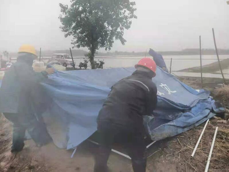 受强对流天气影响,红旗分公司小麦、蔬菜、龙虾塘以及桃园等大面积受损严重。暴风雨过后,红旗分公司党支部连夜成立了应急抢险小组,并第一时间赶赴现场实施救援。得知2个外地来场养殖龙虾的养殖户管理板房被狂风卷走,应急抢险小组连夜调集物资,冒雨加班加点搭建临时救灾帐篷,让受灾户有了安身之地。