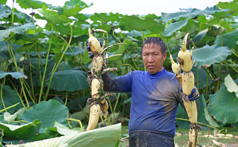 8月18日,华阳河农场公司的藕田里,藕农在采挖鲜嫩的莲藕。近年来,华阳河农场公司依托湖泊群天然优质水资源,积极调整种植结构,发展绿色生态莲藕种植,面积近万亩。目前,莲藕开始采挖,采挖期从今年8月到明年4月,产品主要销往广东和广西“两广”市场,亩均产值约6000元,通过绿色生态莲藕种植,带动企业增效、农户增收。(李 龙 摄)