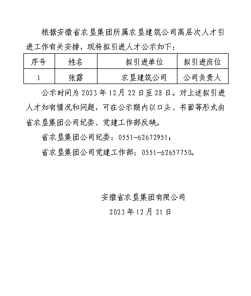 安徽省农垦集团所属农垦建筑公司拟引进人才公示