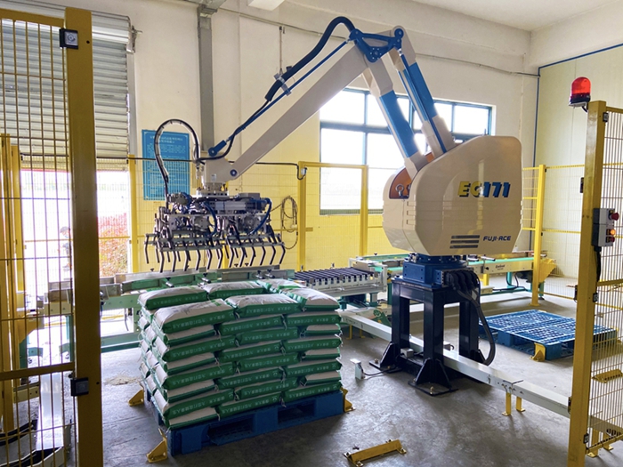 倮倮米业全自动码垛机器人正开展搬运作业。(王玮玥 摄)