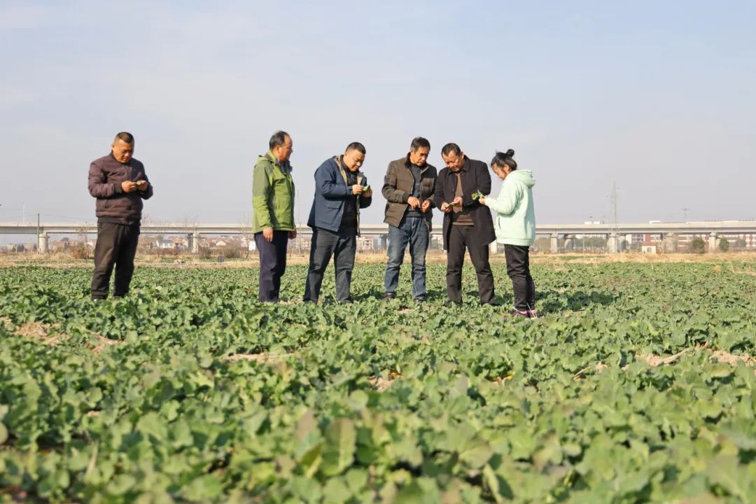 1月21日,华阳河农场农科所的农技人员在湖北省黄冈市黄梅县濯港镇,对社会化服务的8000亩油菜开展病虫害调查和病虫害防效调查。