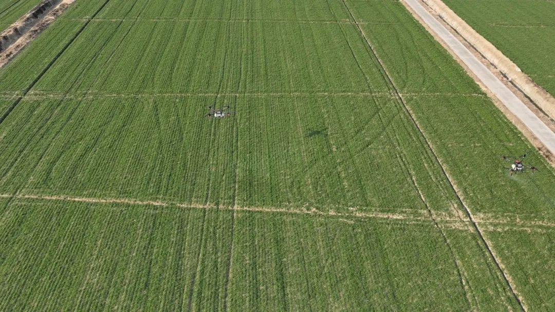 农场植保无人机操作手丁云峰说:“只要给植保无人机划定好作业区域和轨迹,及时添加肥料、更换电池,就会不间断地精准作业,不分白天黑夜。”