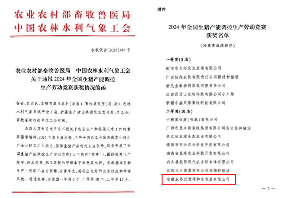 2025年5月27日,农业农村部与中华全国总工会联合发布2024年全国生猪产能调控生产劳动竞赛评选结果,开云手机登录入口汉世伟和安公司荣膺竞赛二等奖。此前,该公司在2024年初举办的安徽省生猪产能调控基地生产劳动竞赛中已荣获一等奖,并因此获得代表安徽省角逐全国奖项的资格。(俞皖黔)