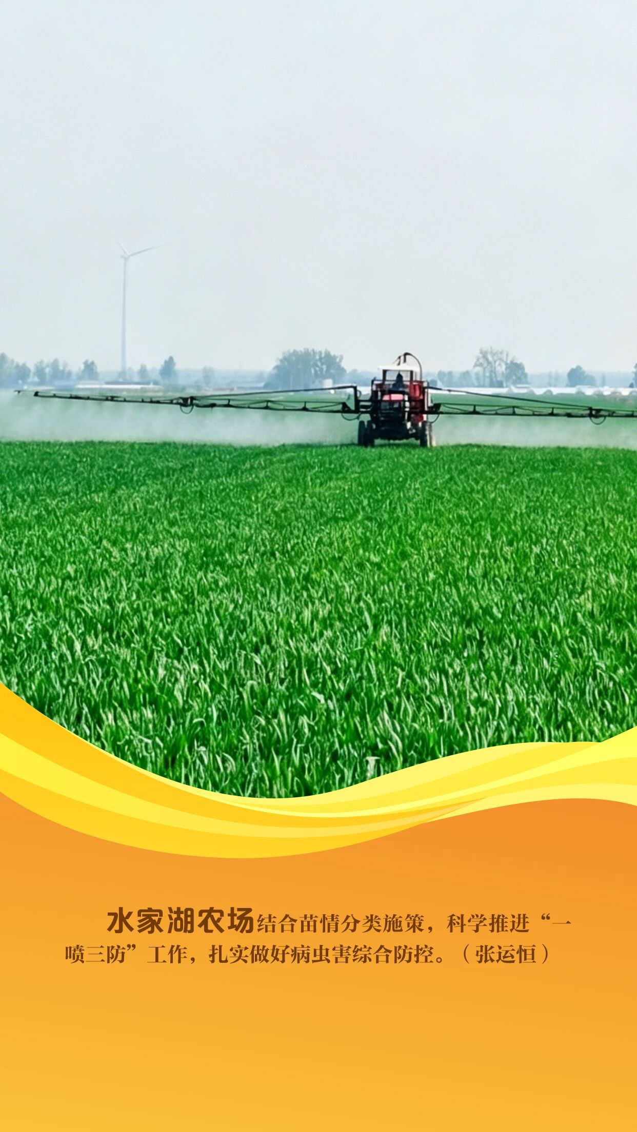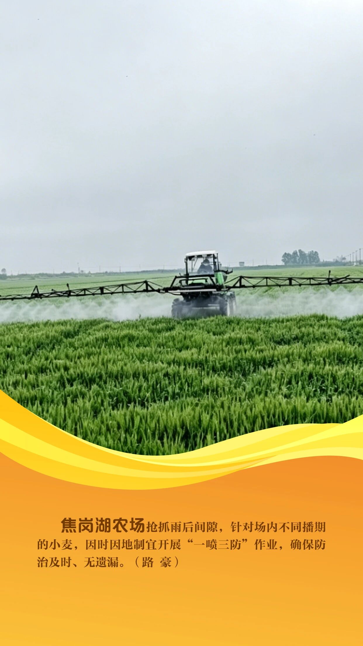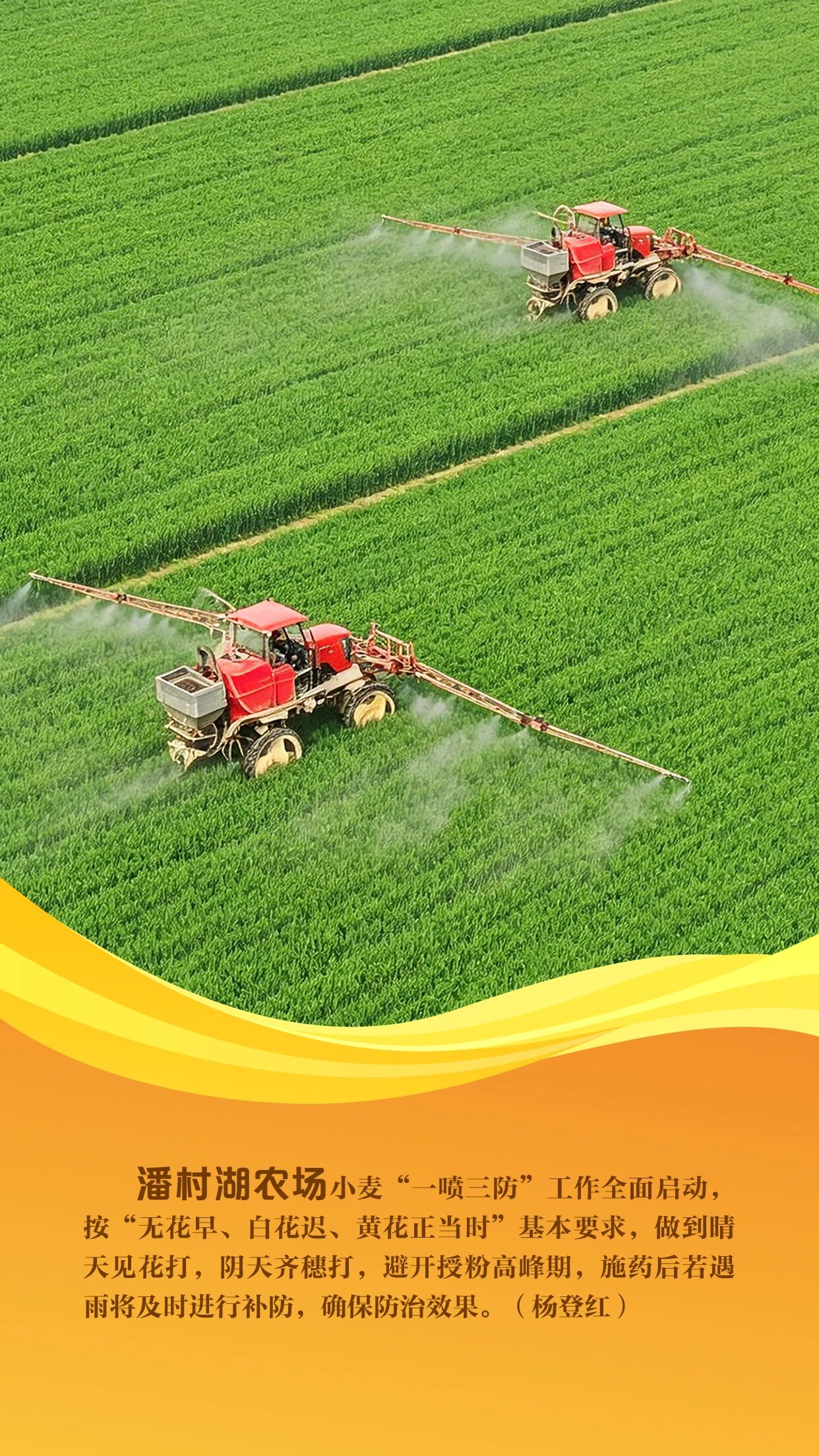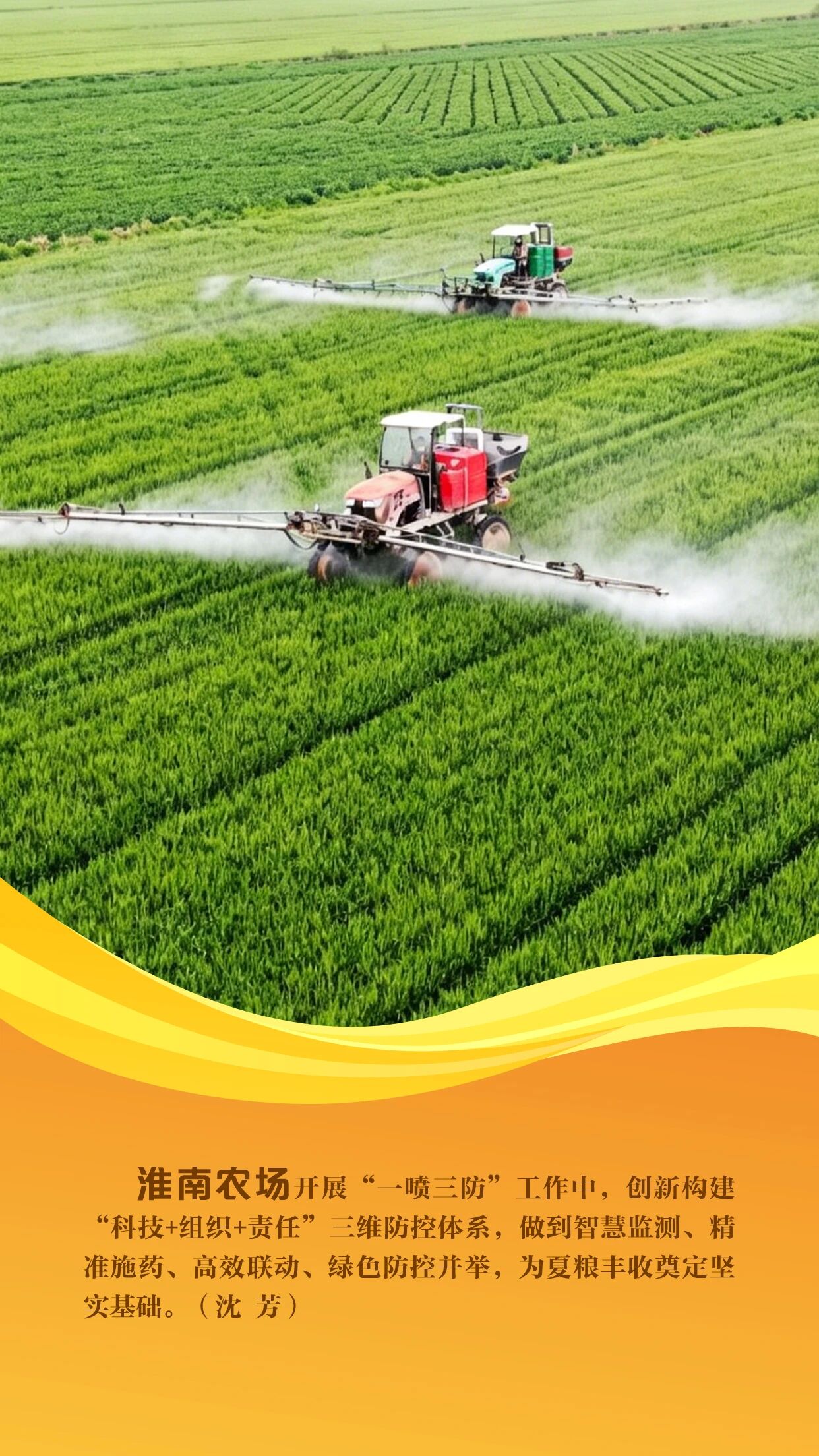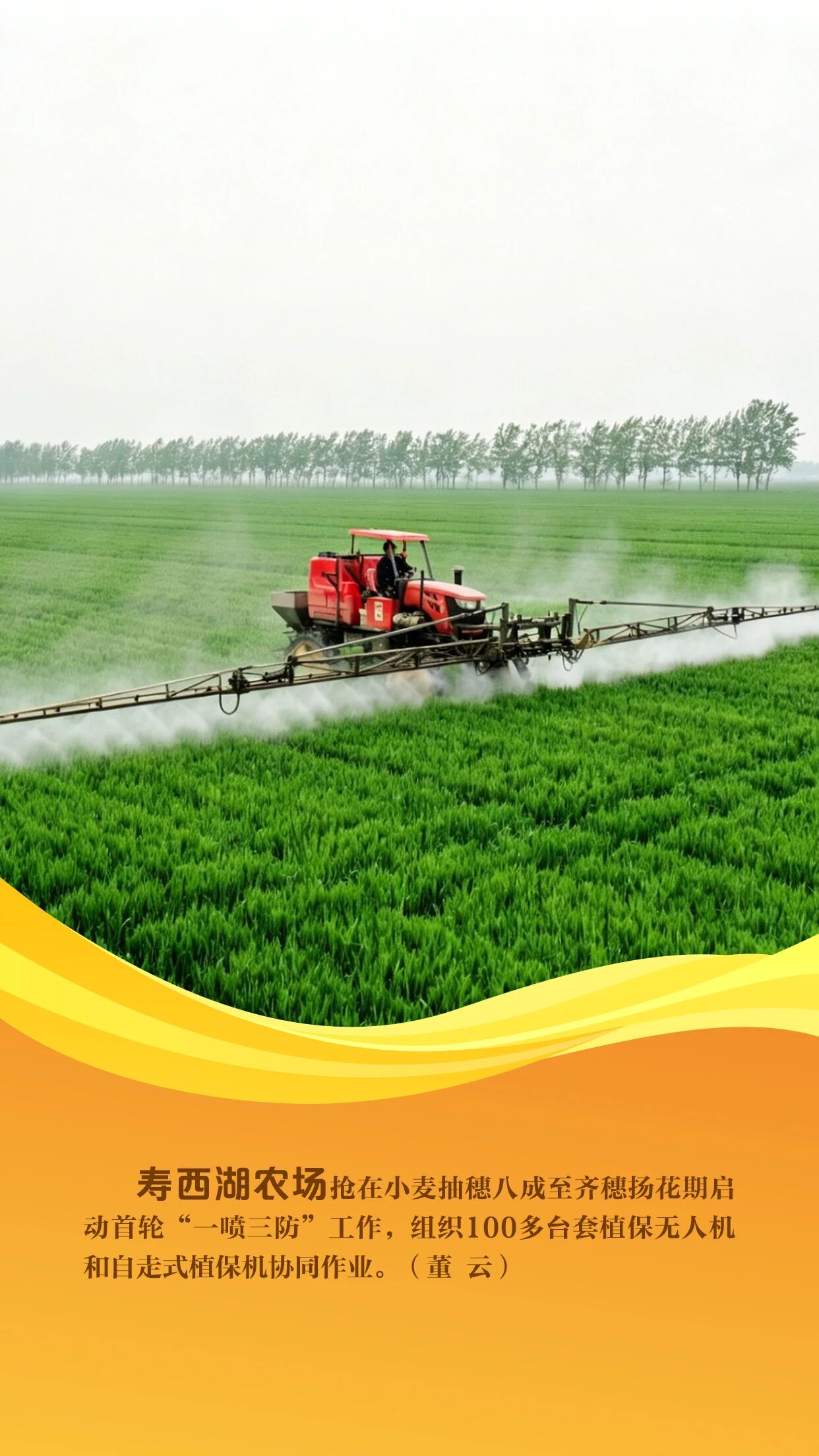 当前,沿淮地区小麦正处于抽穗扬花期,是夏粮产量形成的关键期,也是赤霉病防控的“窗口期”。农垦集团紧扣农时,组织各农场聚焦赤霉病精准防控,全面开展小麦“一喷三防”统防统治工作。各农场利用自走式喷竿喷雾机、无人机等高效植保机械,坚持因地因时制宜、分类管理,开展精准作业、科学施药,全方位筑牢夏粮丰收根基。