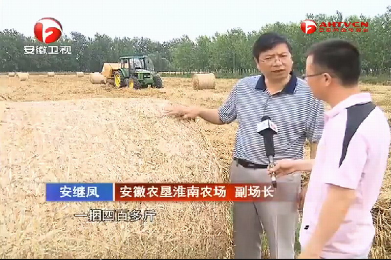 安徽台记者郑志:“我身旁的大型机械正在对地里的小麦秸秆进行打捆处理,打捆之后,大家可以看到,就是我身旁这个结结实实的大家伙,这为小麦秸秆下一步的综合利用创造了条件”。