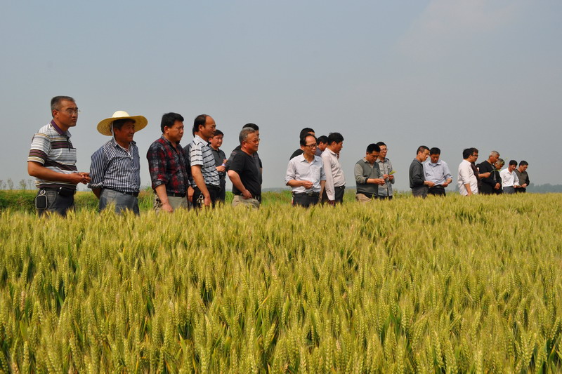 5月20日,滁州市种子管理站专家和种子经销商正在安徽省最大的小麦原良种繁育基地——潘村湖农场察看小麦长势。进入5月中旬以来,各地专家、种子经销商和种田大户纷纷来到农场实地观摩小麦种子田生长情况,并根据小麦形状、纯度、抗性等现场选订中意的麦种。(安徽日报2014年5月22日A1版,杨登宏摄)