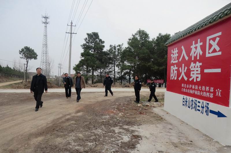 3月17日,滁州市林业局领导陈景涛、林业公安局陶祝兵局长一行到白米山农场检查指导森林防火工作,副场长王仕超作了专题介绍。