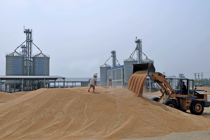安徽垦区小麦产量再创历史新高,其中,寿西湖、龙亢等五个农场的万亩高产示范片全面实现亩产超千斤,科技对安徽垦区农业贡献率已达到61%。(人民日报6月19日第5版,鲍广云摄)