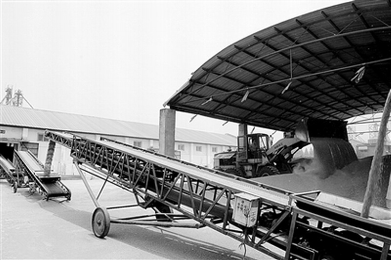 安徽寿西湖农场皖垦种业寿县分公司将收获的小麦通过传送带运输到粮仓中。据悉目前当地烘干设备已全线启动,确保收获的小麦及时烘干。(经济日报2013年6月25日11版,记者乔金亮摄)
