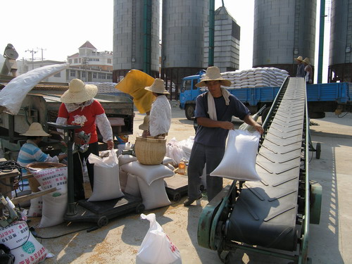 潘村湖农场今年可向社会提供优质小麦良种3000万斤.自7月中旬以来,该场小麦种子销售进入旺季,四方新老客户纷至沓来,企业呈现产销两旺的喜人局面.图为种子公司员工正在将该场出品的小麦良种包装后装车外运的情景.(杨登宏摄)