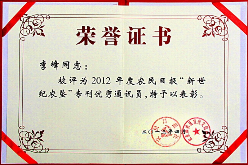 皖垦食品集团宣传干部李峰同志热爱本职工作,勤于笔耕,质量上乘的宣传稿件不断在农民日报和中国农垦杂志上发表,日前被上述两家报刊联合评为2012年度优秀通讯员。(鲍广云)