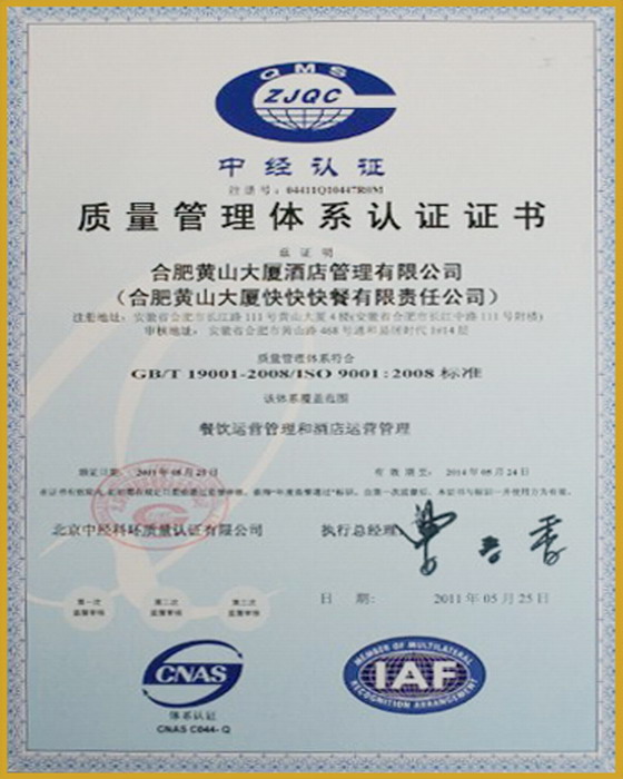 黄山大厦KK快餐公司获得质量管理体系认证证书
