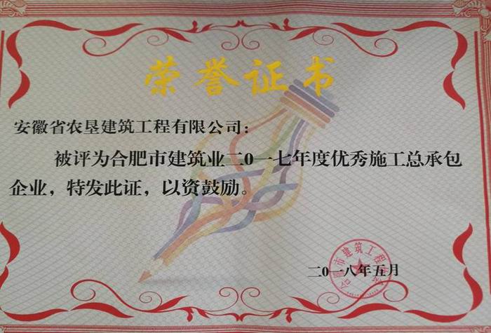 近日,合肥市城乡建设委携手市建筑工程协会举办全市建筑业2017年度先进表彰活动,垦建公司被授予“优秀施工总承包企业”“优秀劳务企业”等多项荣誉称号。
