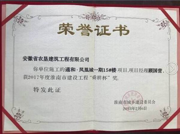 垦建公司:荣获淮南市舜耕杯奖